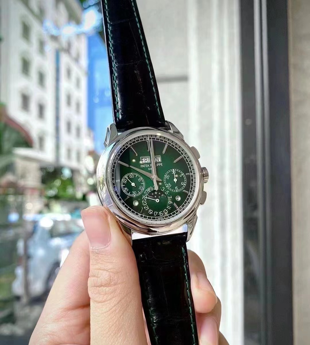 表盘材质:绿漆表盘,黑色渐变效果,金质立体时标,白金琢面剑形指针,白金琢面剑形指针