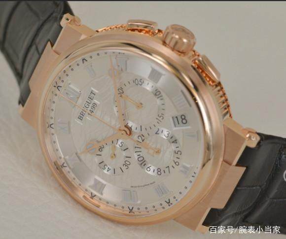 这一款是宝玑航海系5527BR,这款一直很受欢迎,采用镀银金质表盘,玑镂刻花,携刻独立编号与宝玑签名。刻度环采用罗马数字时标,搭载夜光显示功能,分钟计时器位于3点钟位置,小时计时器位于6点钟位置,9点钟位置设有小秒针,日期视窗在4点钟至5点钟位置,刻面金质宝玑指针,搭载夜光现实功能,中央计时指针现实,设计延续了航海风格,也是很受年轻人的喜爱追捧!