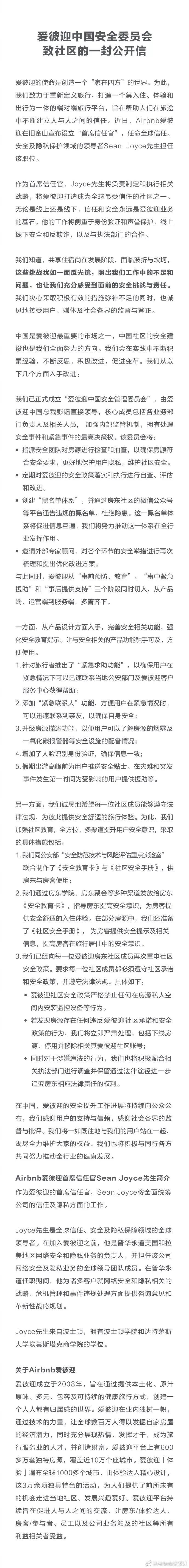 在事件发生之后,爱彼迎官方成立了“爱彼迎中国安全管理委员会”,由爱彼迎中国总裁彭韬直接领导。与此同时,爱彼迎全球设立了“首席信任官”一职,以解决平台上出现的各种信任问题。