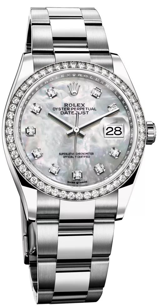 两款新款日志型 36 白色黄金钢款,分别搭配纪念型表带与蚝式表带。五格链节纪念型表带柔韧舒适,是劳力士在1945 年为蚝式恒动日志型(Oyster Perpetual Datejust)专门设计的一款表带。于三十年代末期推出的三格链节蚝式表带,坚固可靠。两款表带均配有摺叠蚝式带扣,带扣亦安装了劳力士研发的易调链节,佩戴者可轻易延长表带约5 毫米。隐蔽式耳盖确保表带和表壳之间达到无缝连接的视觉效果。