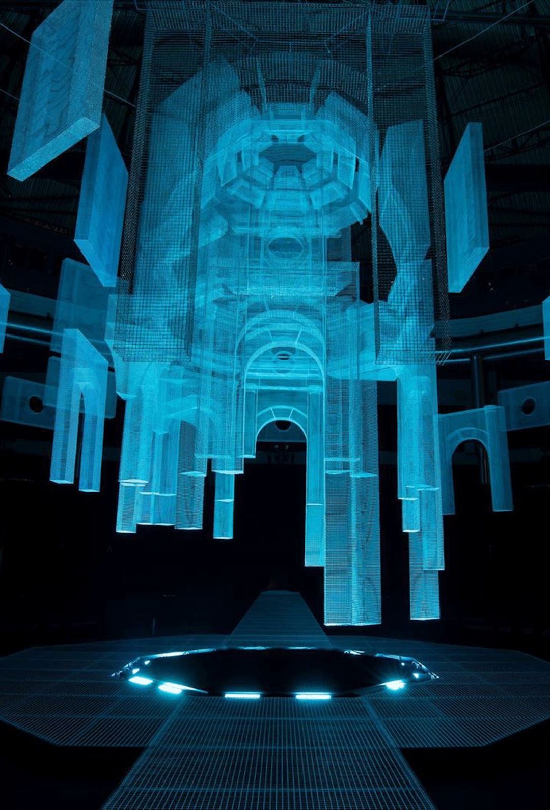 模特沿着看似无限延伸之路行走,逐渐消失在这座巨大的光之建筑中。