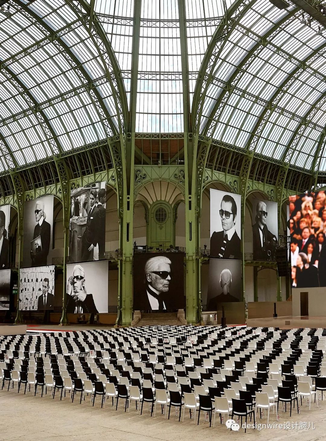 在举行过数场CHANEL大秀的巴黎大皇宫中,三块大屏幕环绕中心播放了Karl的纪录片,50多张照片和白黑相间色的椅子是空间中仅有的装点。