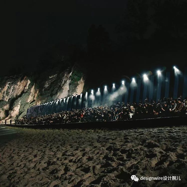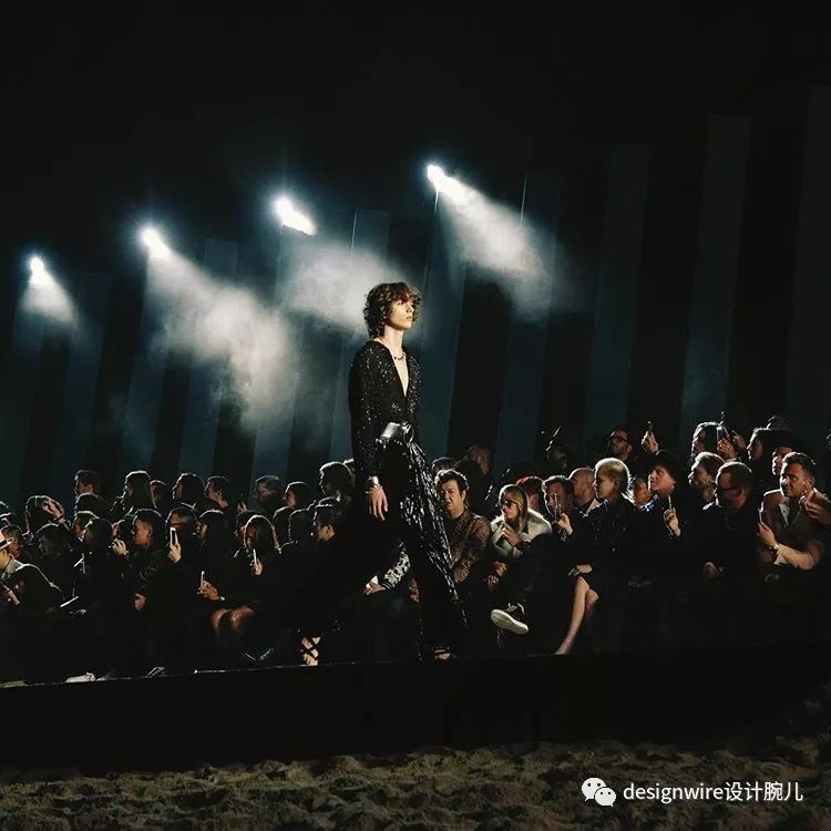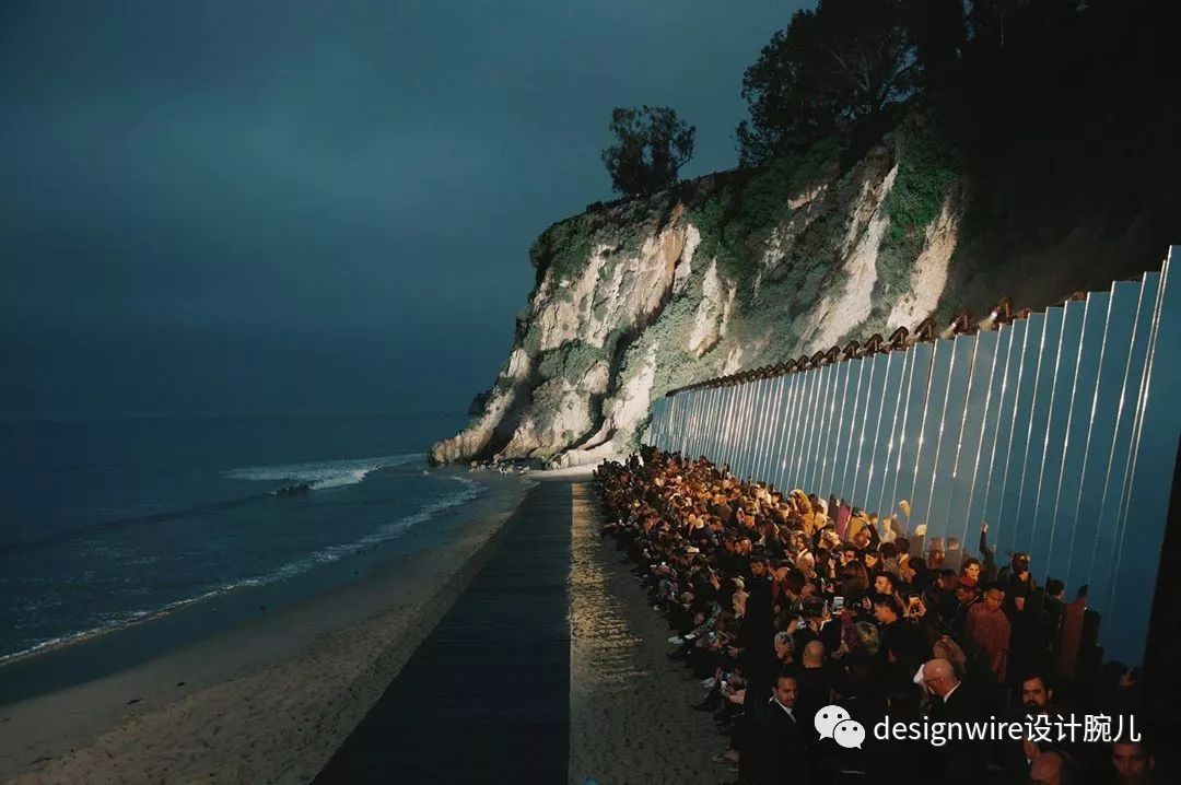在马布里落日海滩上,灰蒙蒙的海雾中模特踏着浪花沿海岸线向走出。客人们面朝大海,背后高耸的镜面在灯光闪动中将秀场化为外星人入侵般的时尚之地。