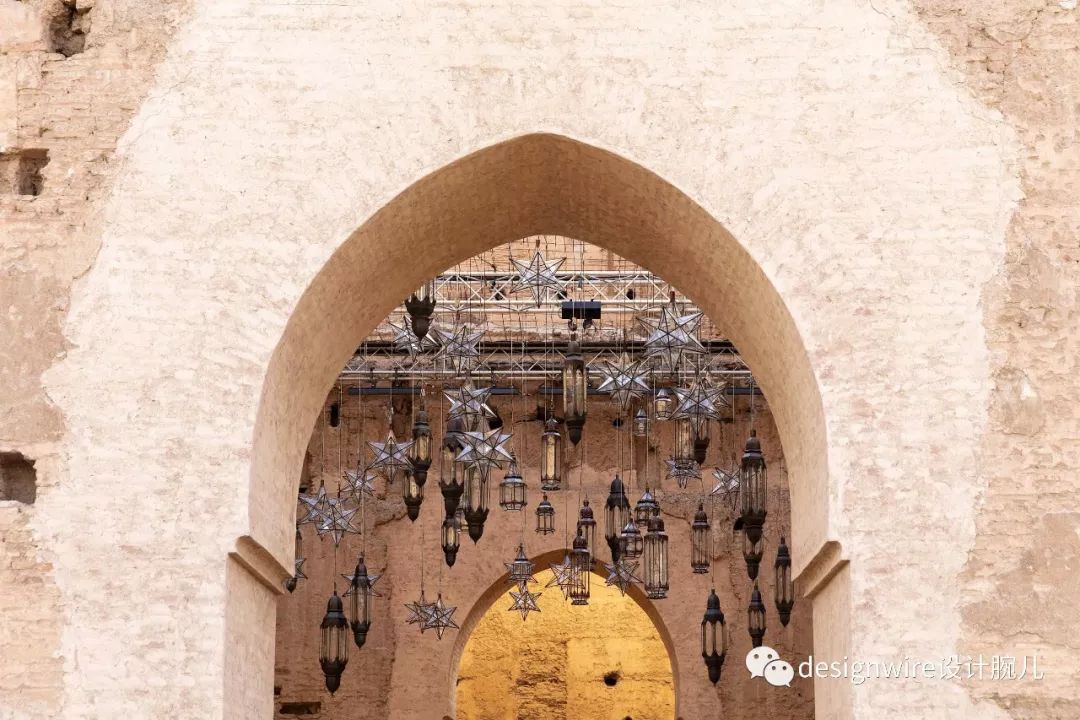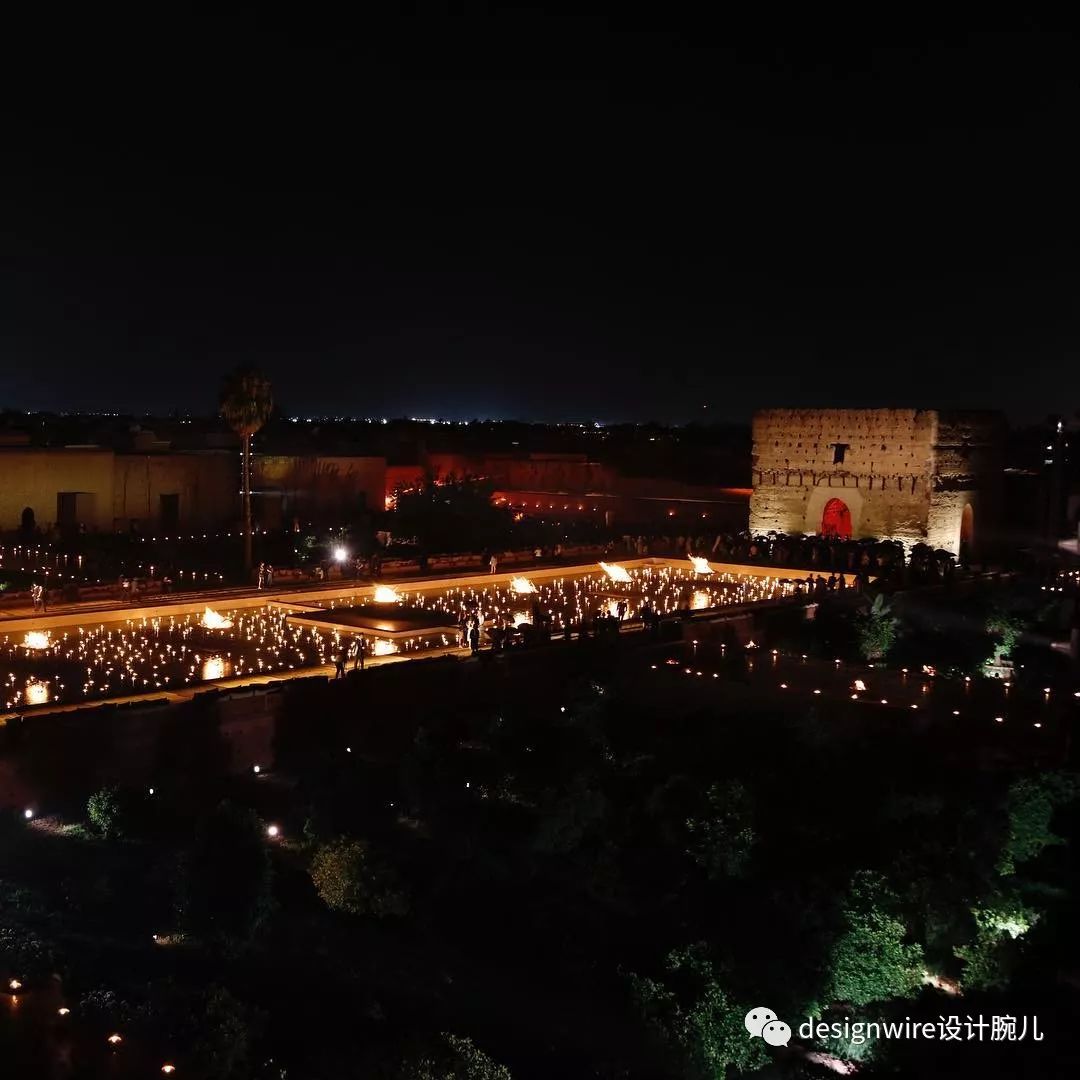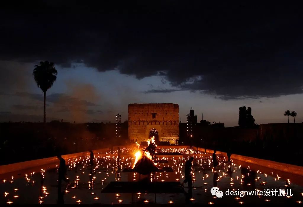 马拉喀什市中心的豪华El Badi宫殿,整个秀场被16世纪堡垒的兵马俑柱廊所环绕,模特们走进庭院环绕着镜面水池开始大秀。水面上点缀着数百把星星火焰,巨大的篝火沿着中轴线从城墙延伸向秀场的前端。