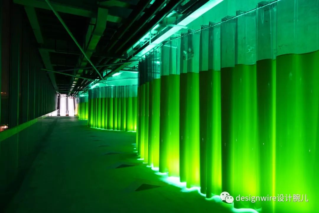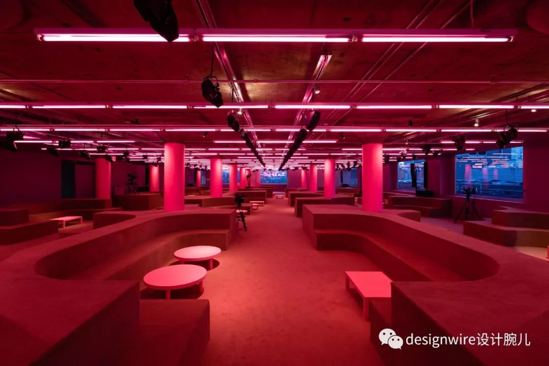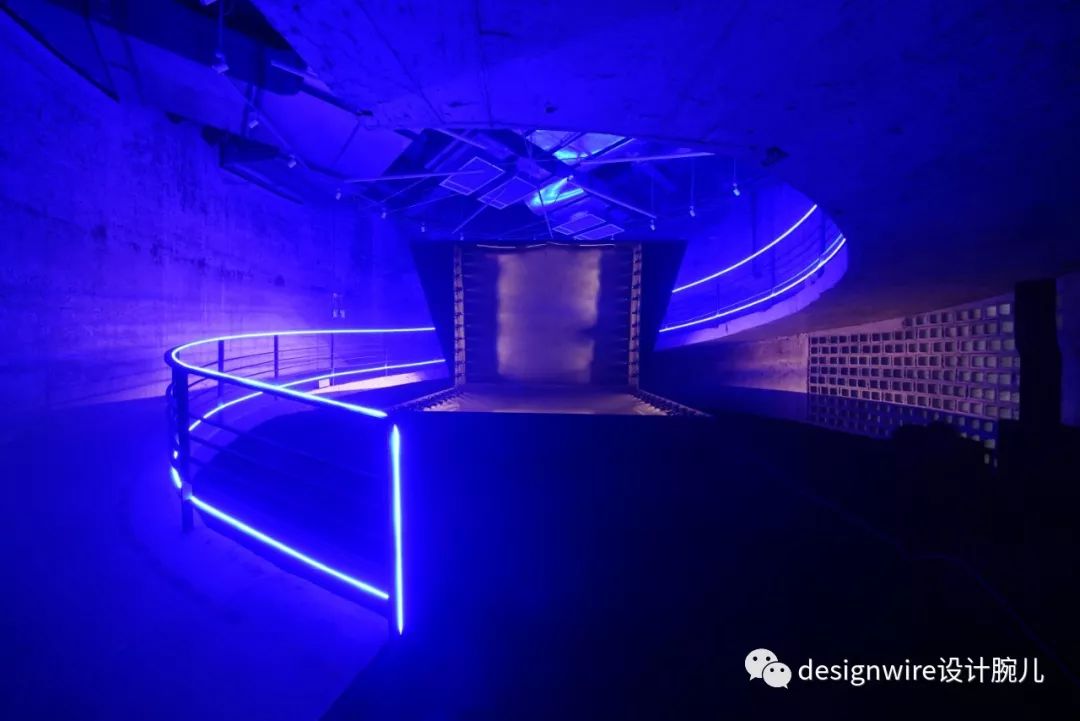 大厅内灯管装置勾勒工业形式语言,增强其错综复杂的几何感,以微妙柔和色彩营造出朦胧纵深。