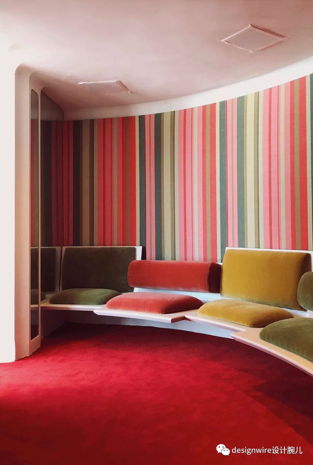秀场空间的其它装置,从咖啡桌到圆柱,均饰以闪亮的粉色涂层,整体仿佛沐浴在粉色的霓虹之中,将内部实用主义构造转化为如室外夏日一般的梦幻奇境。