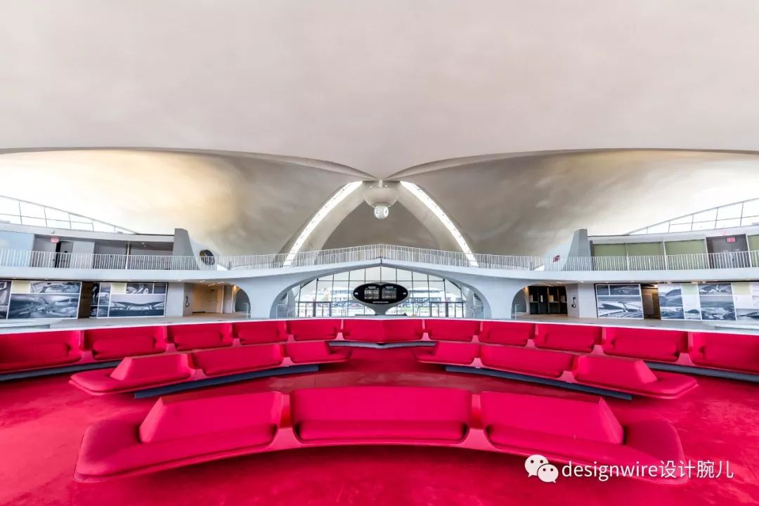 同时,两条管状走廊朝着登机口走去, TWA机场的红色的内饰与灰色的混凝土材料形成的强烈对比,为旅客留下旅行中深刻的印象。
