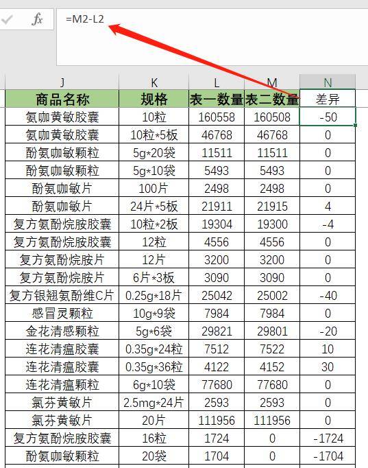 名称和规格一致的视为同一个商品,现需要核对两表中相同商品的库存数量是否有差异,有差异的品种也需要标记出来。